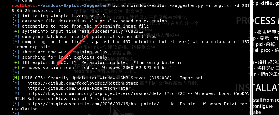 [*] download   : bug.txt -> /root/Windows-Exploit-Suggester/bug.txt然后使用windows-exploit-suggestions进行查看