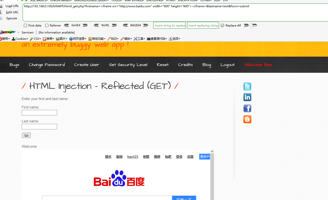 http://192.168.0.100/bWAPP/htmli_get.php?firstname=<iframe src="http://www.baidu.com" width="800" height="600"></iframe>&lastname=test&form=submit