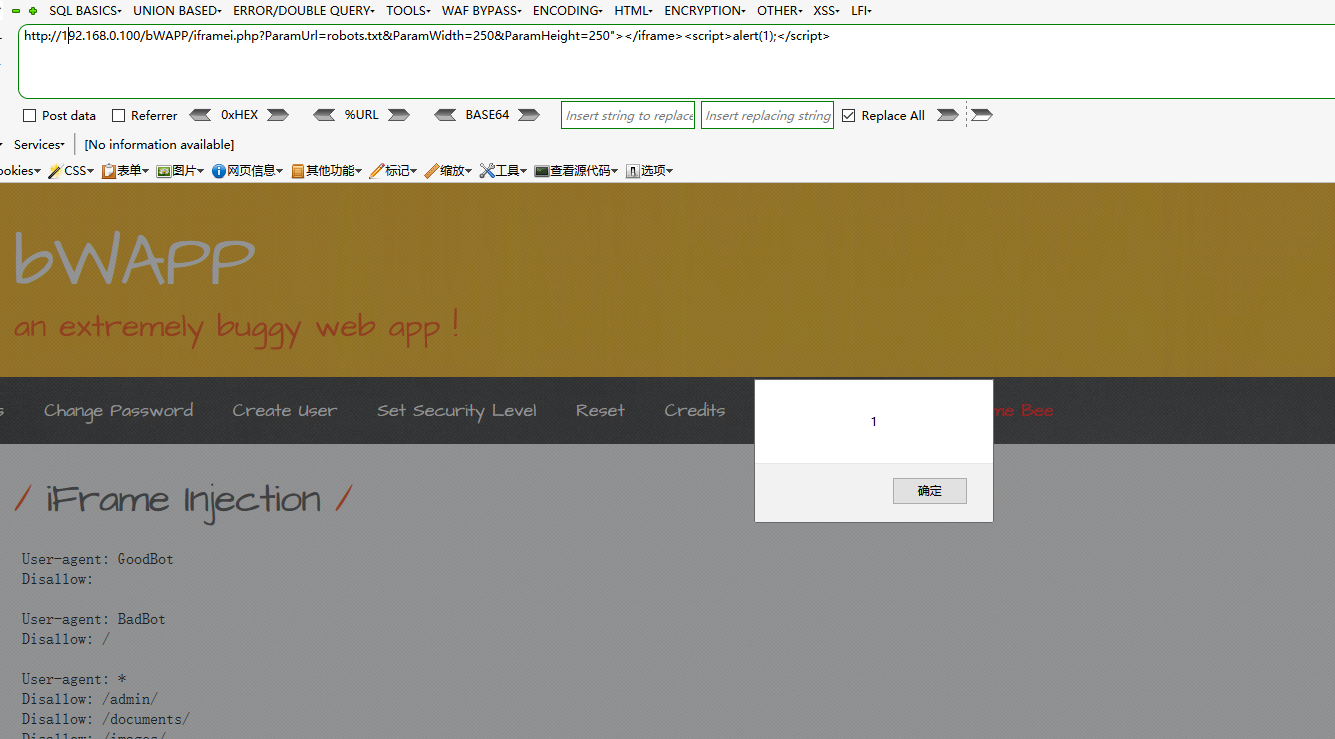 http://192.168.0.100/bWAPP/iframei.php?ParamUrl=index.php&ParamWidth=800&ParamHeight=500漏洞利用