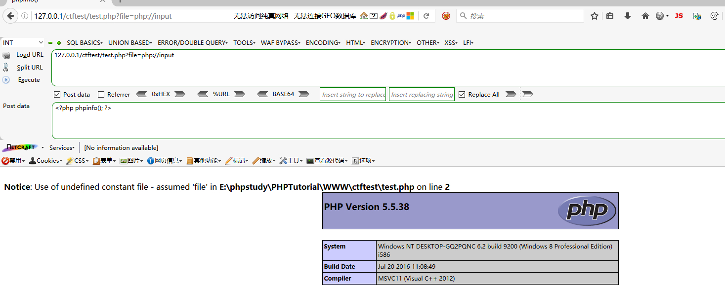 解释:上面filter既然能读文件,肯定还能写文件,这就可以利用input将数据POST过去,即php://input是用来接收post数据的;