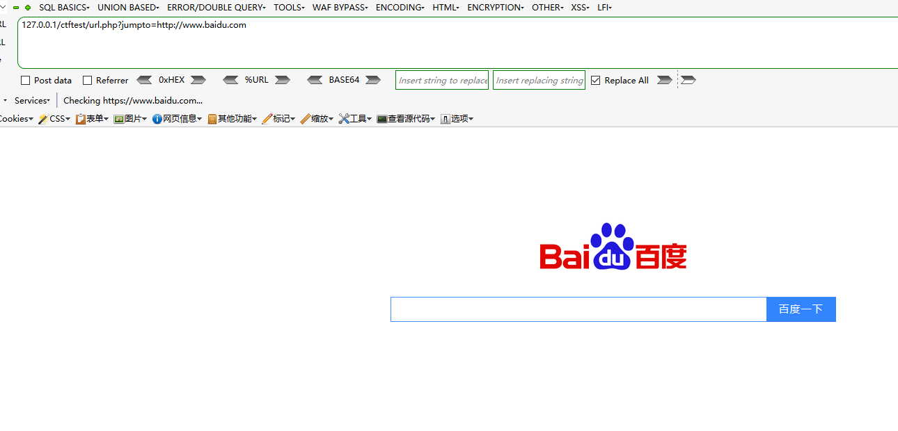 一种是利用程序自己的公共白名单可信站点,如www.baidu.com,其中百度有个搜索的缓存链接比如https://www.baidu.com/linkurl=iMwwNDM6ahaxKkSFuOG,可以最终跳转到自己网站,然后测试时: