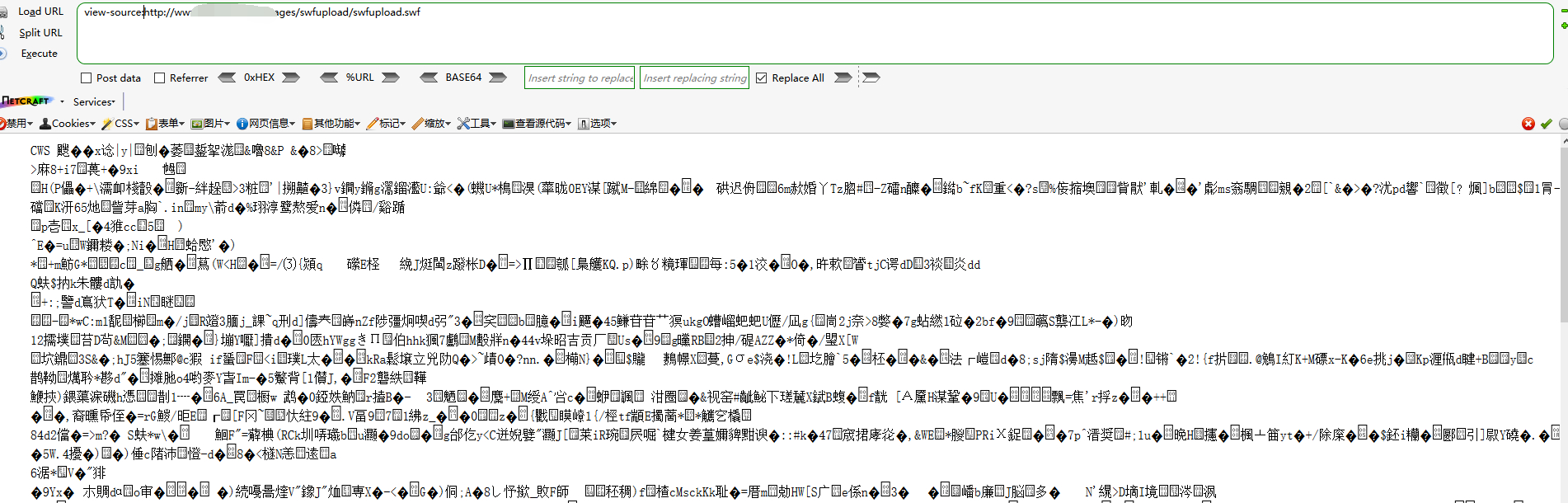 可以直接浏览器查看swf 源码 view-source:http://www.xxx.com/xx.swf ,可以看到是CWS开头的一段乱码,即编译好的 action script 2/3 代码